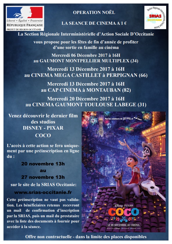La Section Régionale Interministérielle d’Action Sociale D’Occitanie vous propose pour les fêtes de fin d’année de profiter d’une sortie en famille au cinéma Mercredi 06 Décembre 2017 à 16H au GAUMONT MONTPELLIER MULTIPLEX (34) Mercredi 13 Décembre 2017 à 16H au CINEMA MEGA CASTILLET à PERPIGNAN (66...