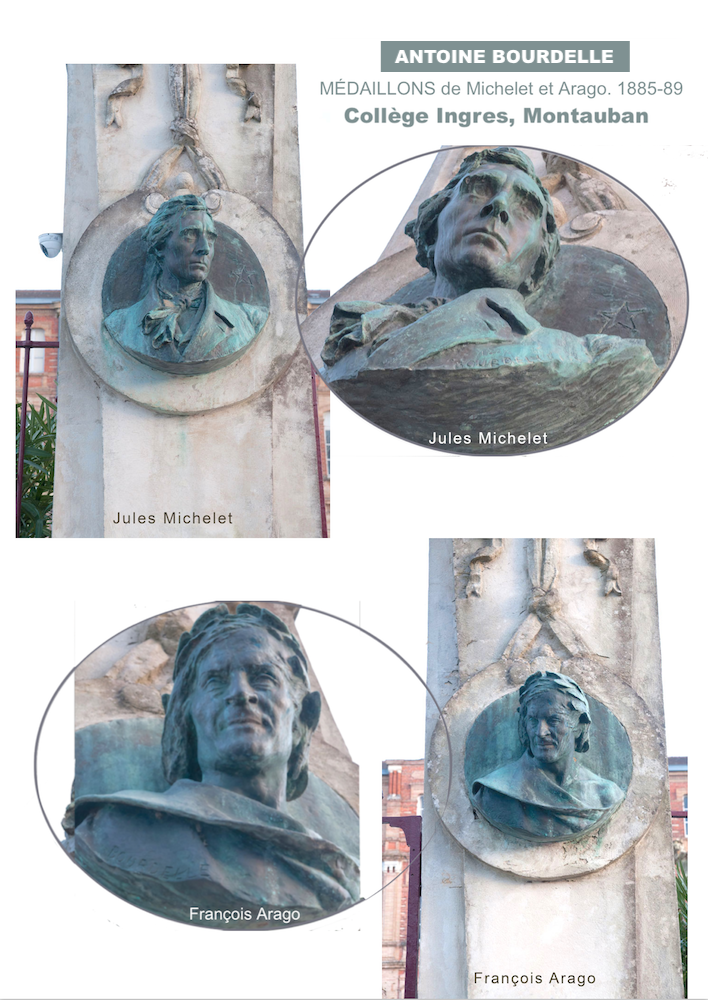 Antoine Bourdelle, Médaillons (sans titre), 1885 à 1889 Collège Ingres - 4, place du Général Leclerc - MONTAUBAN (82) Constituants plastiques Devant l’entrée du collège Ingres se trouvent deux piliers ornés de deux médaillons en haut-relief. (cliquez sur l'image). Il s'agit de sculptures en bronze...