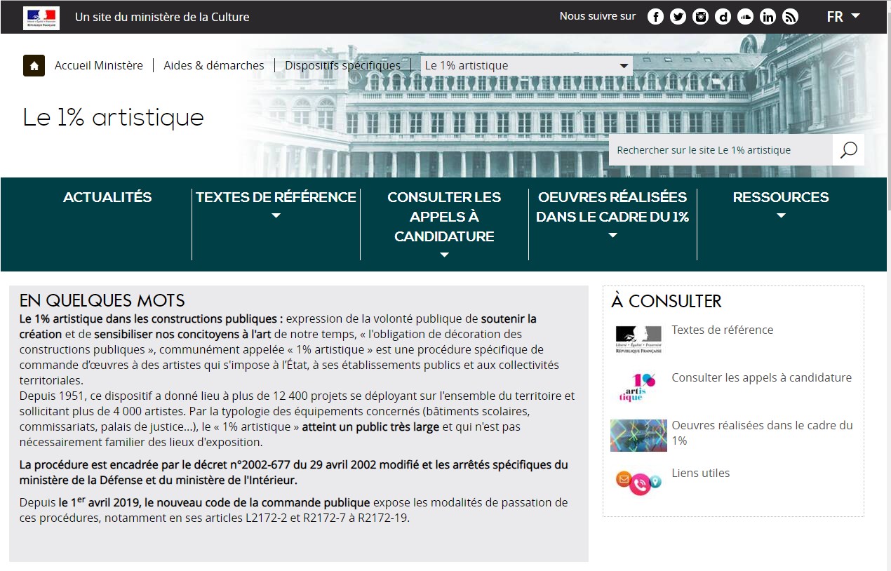 La mesure, le décret Le 1 % artistique est une mesure qui consiste à réserver 1% du montant HT de toute construction publique pour la réalisation d'une œuvre intégrée à l'architecture. Il est l'objet d'un appel à candidature. Après avis d'un comité artistique, qui définit le programme de la commande...