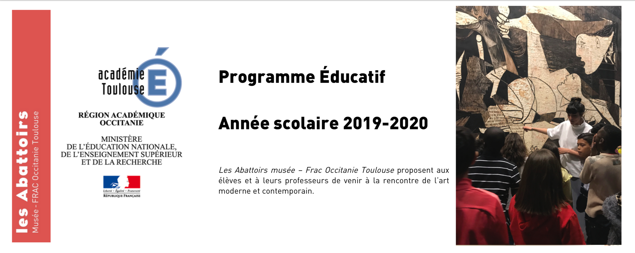 Le programme éducatif du Musée des Abattoirs pour l'année scolaire 2023-24 vient de paraître. Cliquez sur l'image pour le télécharger. Vous trouverez ci-dessus le document à télécharger, comprenant la présentation des expositions à venir, Toulouse et région, le rappel des services proposés, des...