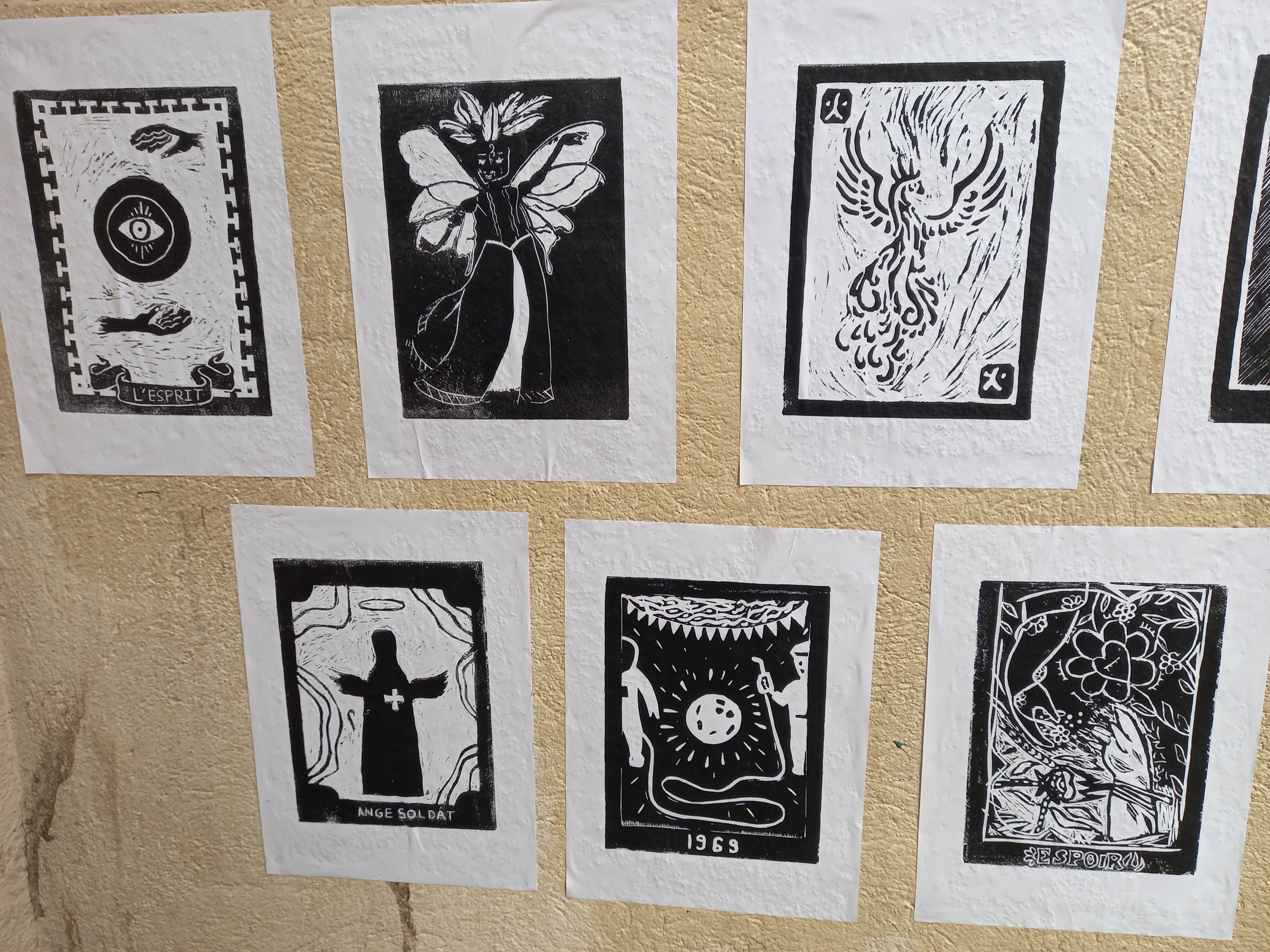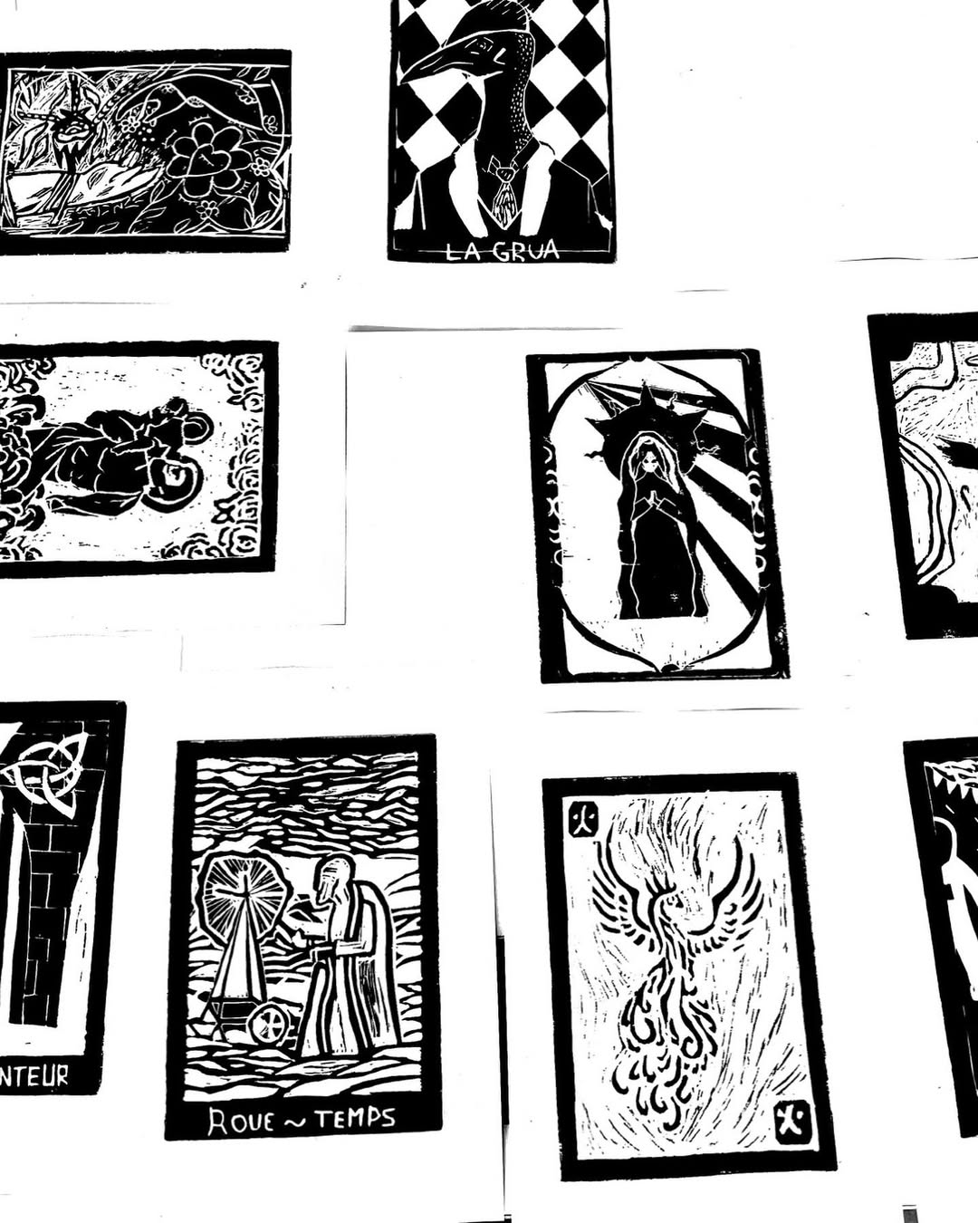 L'exposition intègre également un ensemble d'arcanes : des linogravures conçues comme un tarot de cet héritage. Chaque carte est une interprétation symbolique d'un fragment de la mémoire. Ces arcanes prolongent le travail personnel dans une dimension plus universelle, où les récits individuels deviennent des mythes, des signes, des présages. Elles illustrent un langage commun, universel et symbolique.