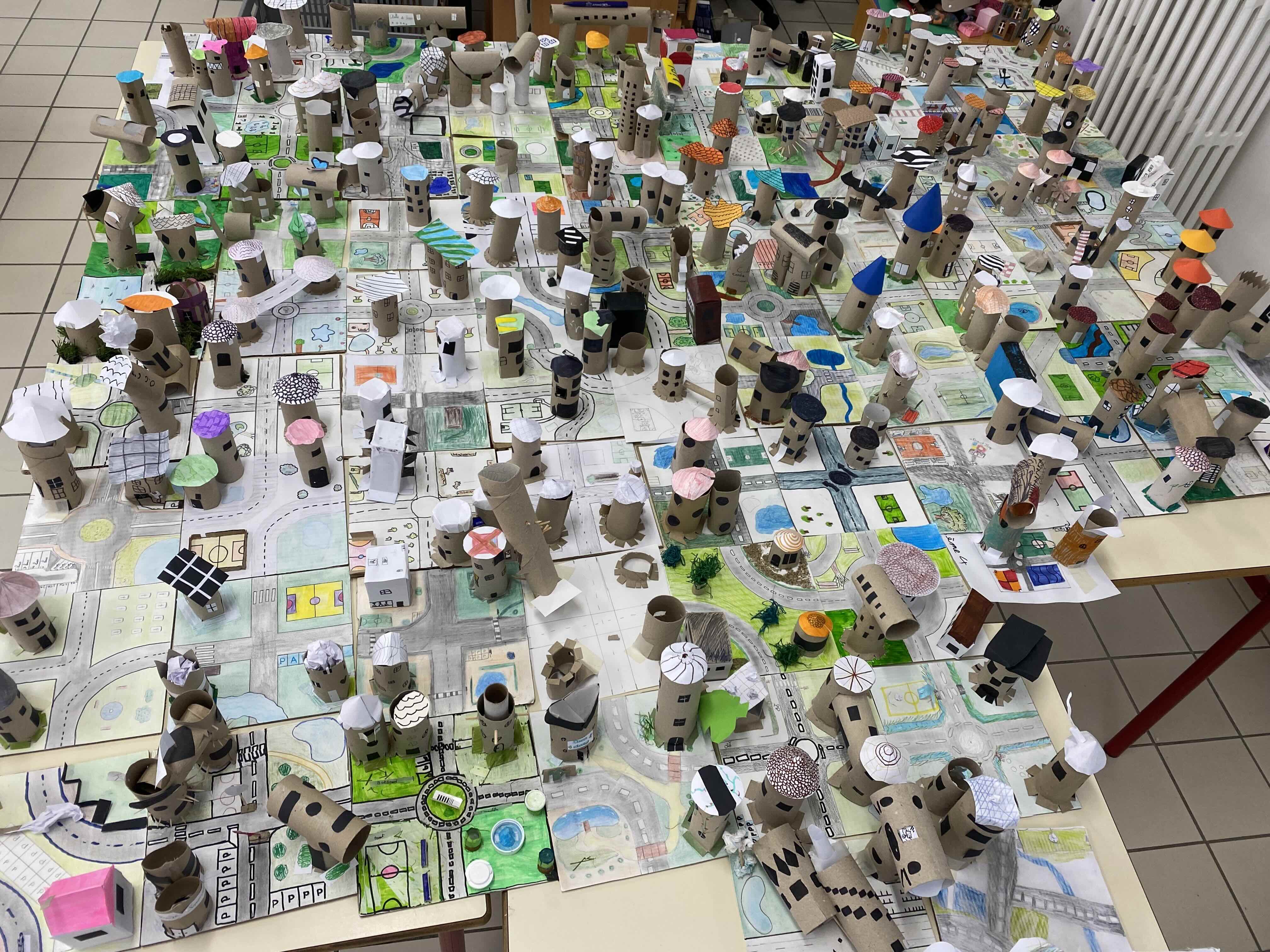 Chaque élève a conçu une portion de 20 × 20 cm, composée de bâtiments, de routes et d’espaces verts, en utilisant principalement des matériaux de récupération : cartons, papiers, rouleaux d’essuie-tout et de papier toilette.
