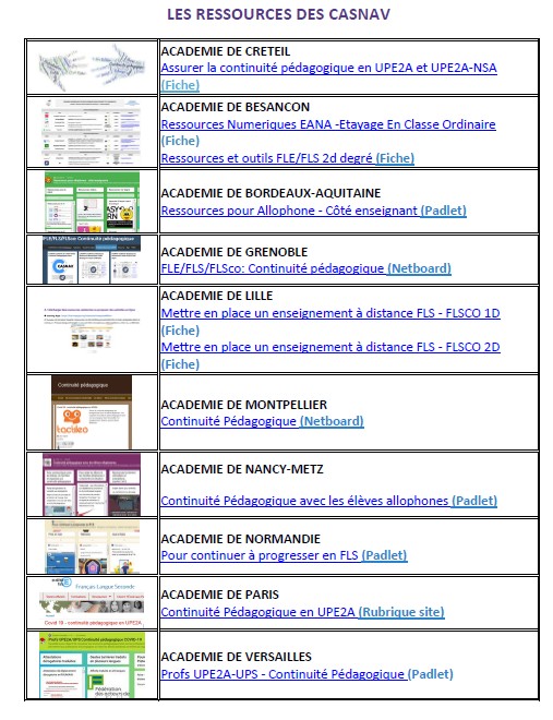 Toutes les ressources proposées par les CASNAV : fiches, padlets, netboards...