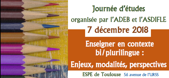 La prochaine Journée d'Etudes Asdifle - ADEB Enseigner en contexte bi/plurilingue : enjeux, modalités, perspectives aura lieu le vendredi 7 décembre prochain à l'ESPE de Toulouse.