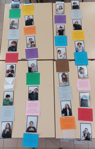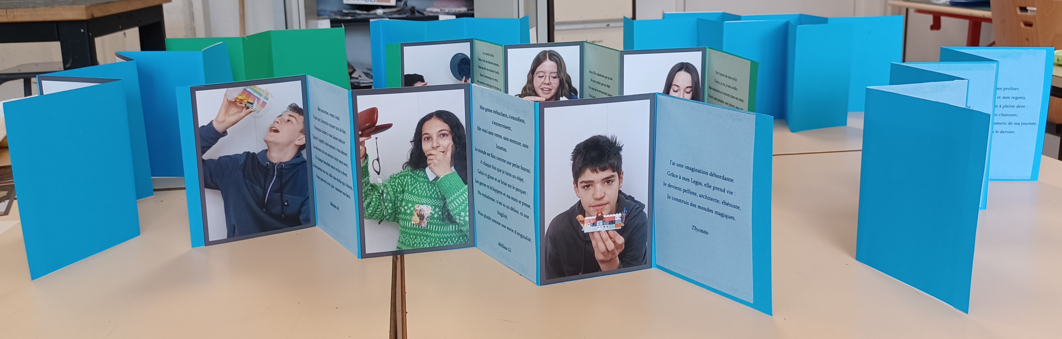 À l’image des portraits de Beethoven réalisés par Bourdelle, ils ont ensuite enrichi leurs autoportraits d’une strophe poétique. L’ensemble a ainsi permis la création d’une vidéo et de deux structures plastiques. Une structure de 2 m de haut sur 1 de large montre les autoportraits et les poèmes dans une forme de mosaïque d’identités. Plus intimes, des dépliants en accordéon invitent les visiteurs à lire et à observer d’autres autoportraits mis en poésie.