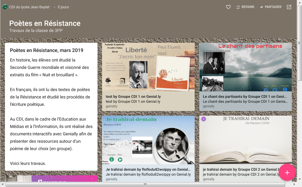 Séance pédagogique d'éducation aux médias et à l'information (EMI) avec des élèves de 3ème prépa-pro. Ils ont travaillé sur des poètes de la Résistance et sur les procédés de l’écriture poétique en français, ils ont ensuite créé un document interactif (Genialy) en EMI pour agréger des ressources...