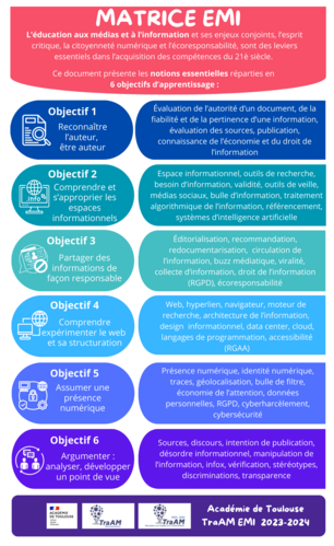 L’objectif de la matrice EMI de l’Académie de Toulouse est de donner un cadre d’appui aux professeurs documentalistes et à l'ensemble des enseignants pour intégrer l’EMI à leurs séances pédagogiques : définir des objectifs et un vocabulaire commun mais également structurer les parcours EMI dans les établissements.