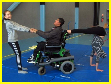 Acrosport en fauteuil pour partager des figures inclusives en acrosport.