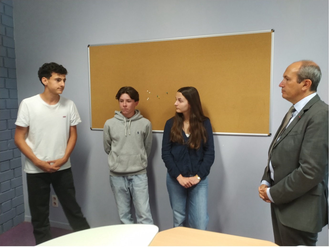 La visite s’est conclue par la présentation du projet Erasmus, portée par des élèves de 5ème Segpa accompagnés par leur professeure Magalie Frezouls, à l’initiative de cette démarche. Ce projet, prévu sur 3 ans, a pour objectif de permettre aux élèves de Segpa de se rendre dans un pays partenaire afin de rencontrer d’autres élèves européens. Ensemble, ils réfléchissent à des thématiques citoyennes telles que la construction d’une réussite éducative, le développement de la mobilité des apprenants et la formation des citoyens européens.
