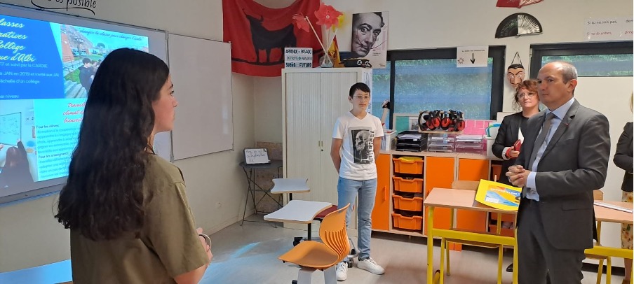 Dans un troisième temps, Monsieur Le Recteur a pu découvrir l’espace d’une classe coopérative, un projet suivi par la CARDIE et dont le CNR a permis l’aménagement afin de faciliter le travail en groupe, le tutorat, une pédagogie différente. Ce cadre permet à l’enseignant d’accompagner l’élève vers la réussite tout en instaurant un climat de classe propice au bien-être, à l’entraide et au partage. Des élèves de 3ème, accompagnés de leur professeure responsable du projet Stéphanie Gaillardin, ont présenté les heures de coopération intégrées à leur emploi du temps (conseil coopératif et tutorat) ainsi que les objectifs d’une classe coopérative.