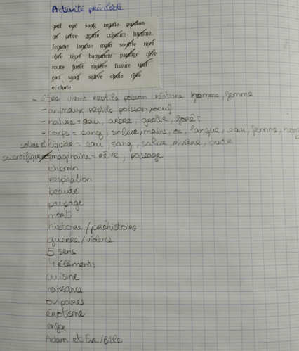 Le professeur distribue aux élèves la liste des mots présentés dans l’extrait. Par deux, les élèves doivent regrouper certains mots de manière à créer le maximum de catégories possibles. Un mot peut évidemment appartenir à plusieurs catégories. Les élèves listent ces catégories dans leur cahier. Par exemple, dans la catégorie « animal » on peut relever « reptile », « poisson », « œuf ».