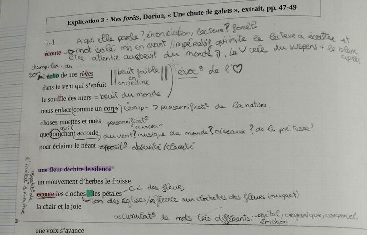 L’explication linéaire se déroule ensuite en alternant, pour chaque mouvement du texte, les remarques et analyses écrites sur / autour du texte et une synthèse davantage rédigée et inscrite dans le cahier.