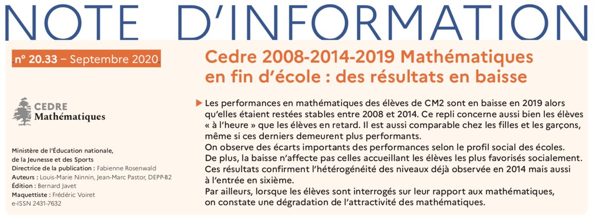 Note d’Information n° 20.33 – septembre 2020 Les performances en mathématiques des élèves de CM2 sont en baisse en 2019 alors qu’elles étaient restées stables entre 2008 et 2014. Ce repli concerne aussi bien les élèves « à l’heure » que les élèves en...