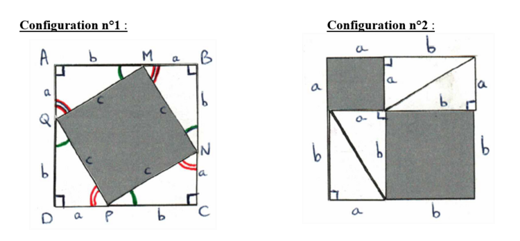 L’objectif de cette activité est de faire apparaître cette égalité de Pythagore et l’image mentale des carrés tracés à partir des trois côtés du triangle rectangle.