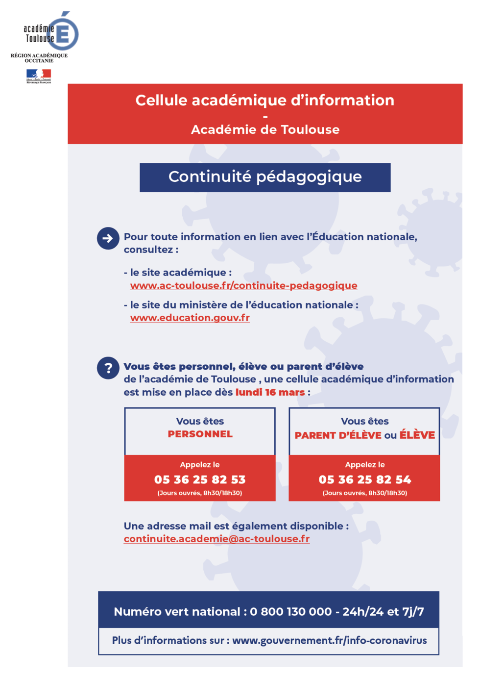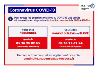 Pour toutes les questions relatives au Covid-19, une cellule d'information est disponible du lundi au vendredi de 8h30 à 18h30. Elle est à l'écoute de tous les personnels de l'académie, les parents d'élève et les élèves.
