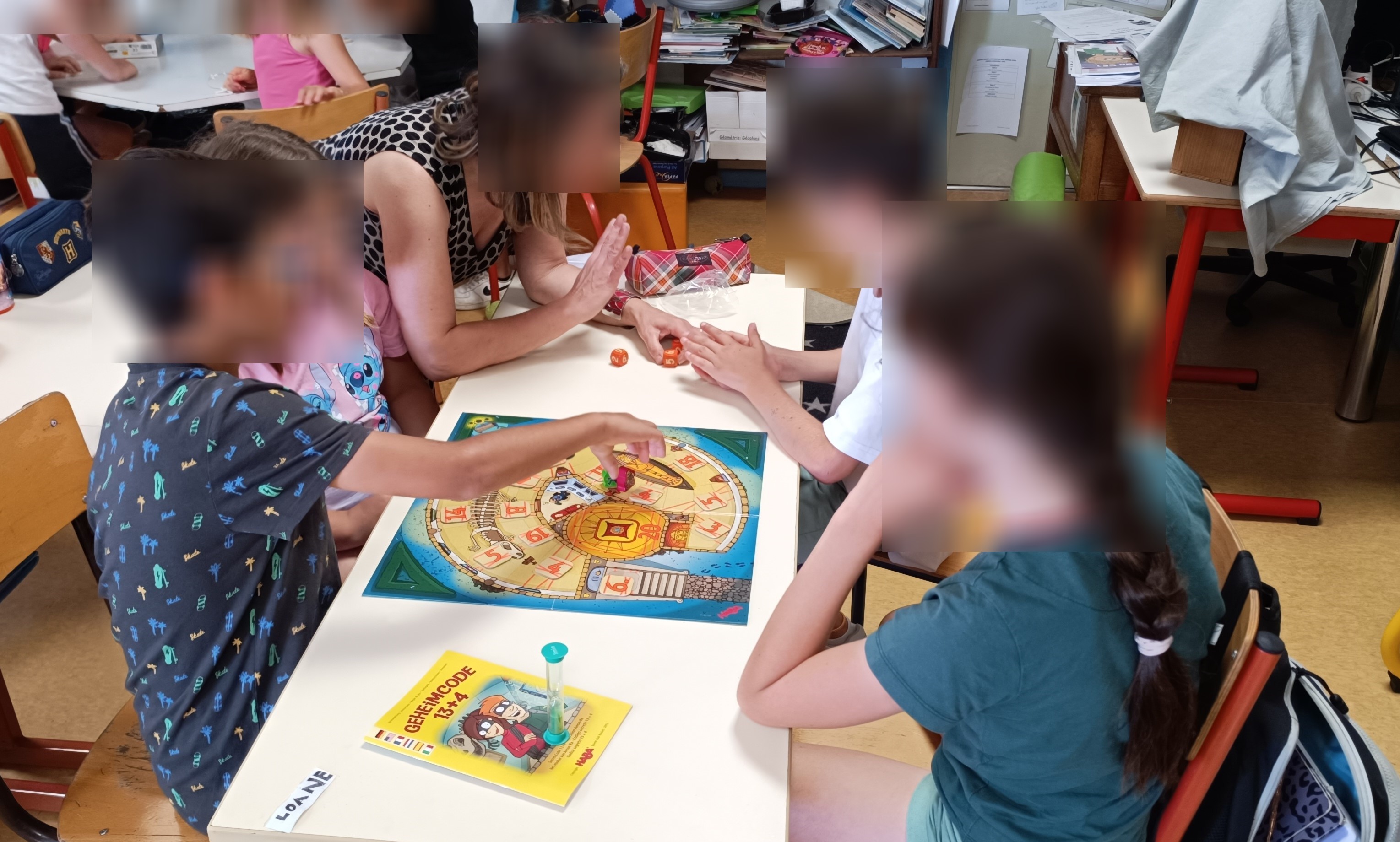 Toc-toc-toc… Ce matin, Maitresse Carole nous ouvre les portes de sa classe de CE2-CM1, à l’école de Lorp. Les élèves sont répartis en groupes de 4 et 5. Nous entendons le bruit des dés lancés sur la table par les enfants, mêlés aux rires et aux échanges oraux des élèves. Tous jouent aux jeux mathématiques sortis de la malle Mathémakits posée sur la table du premier rang de la classe.