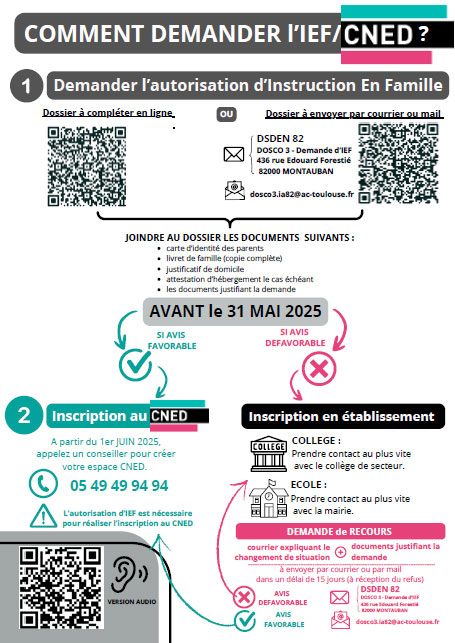 Infographie à diffuser aux familles demandant des informations concernant la scolarisation au CNED et /ou l'instruction en famille (IEF). Elle a pour but de clarifier les étapes de la procédure. La scolarisation établissement restant le mode de scolarisation à privilégier. Rappel pour les élèves de