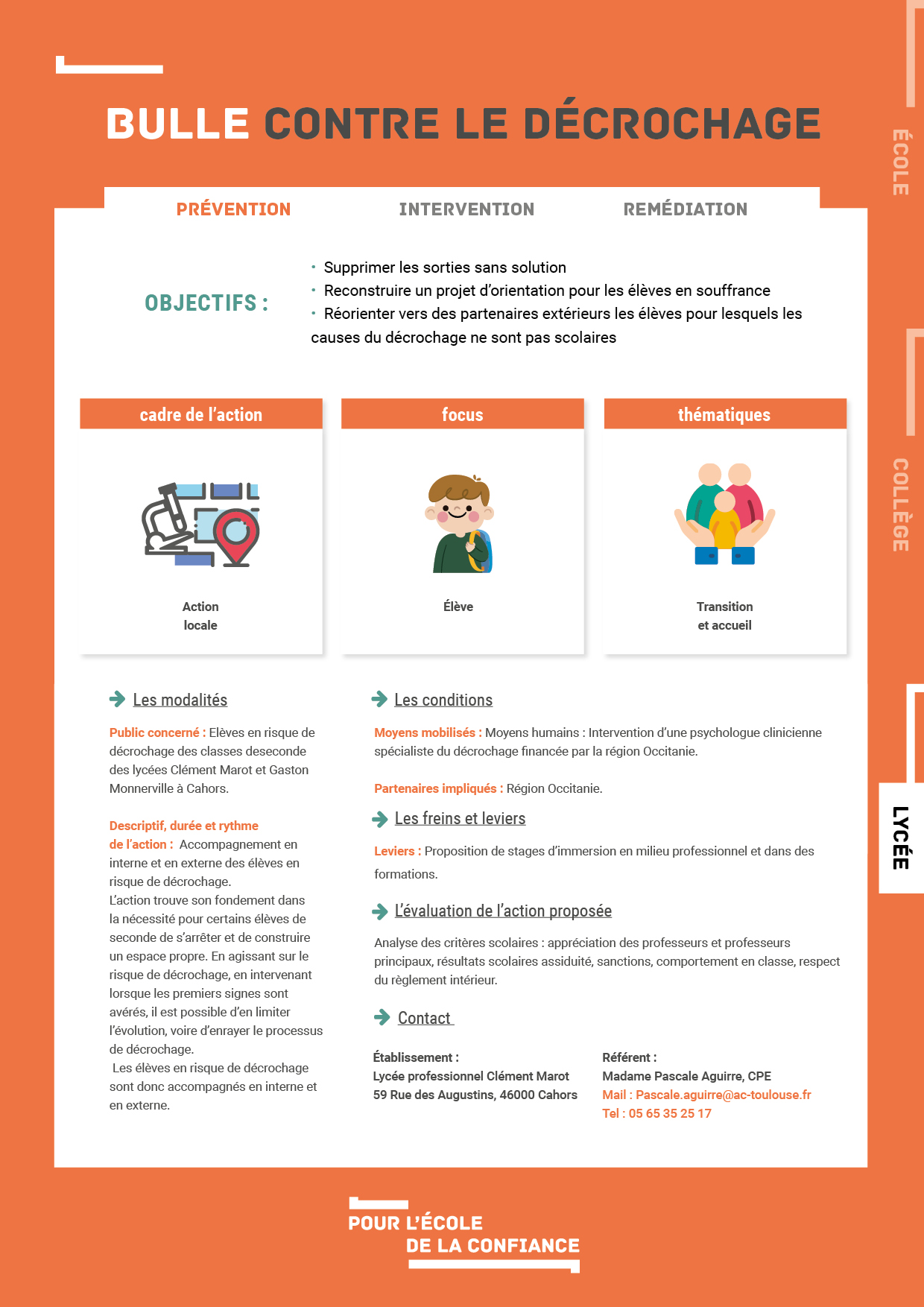 Objectifs : Supprimer les sorties sans solution, reconstruire un projet d’orientation pour les élèves en souffrance, réorienter vers des partenaires extérieurs les élèves pour lesquels les causes du décrochage ne sont pas scolaires.