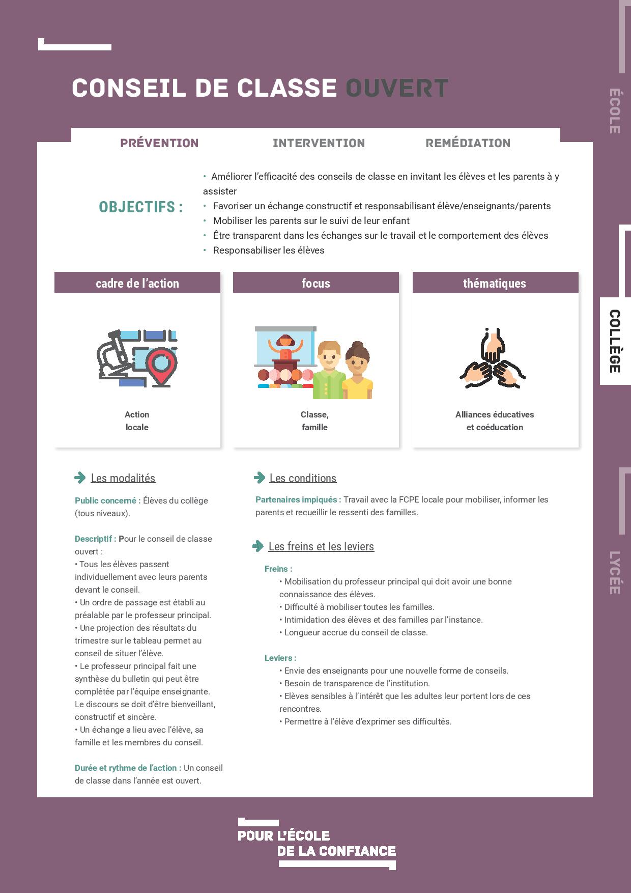Objectifs : améliorer l’efficacité des conseils de classe en invitant les élèves et les parents à y assister, favoriser un échange constructif et responsabilisant élève/enseignants/parents, mobiliser les parents sur le suivi de leur enfant, être transparent dans les échanges sur le travail et le...