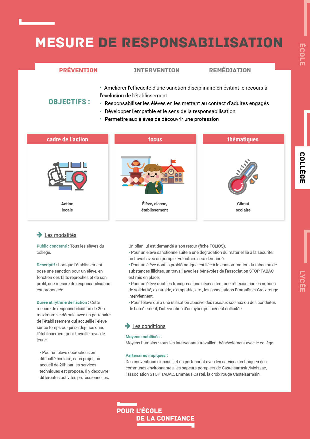 Objectifs : Améliorer l’efficacité d’une sanction disciplinaire en évitant le recours à l’exclusion de l’établissement, responsabiliser les élèves en les mettant au contact d’adultes engagés, développer l’empathie et le sens de la responsabilisation, permettre aux élèves de découvrir une profession.