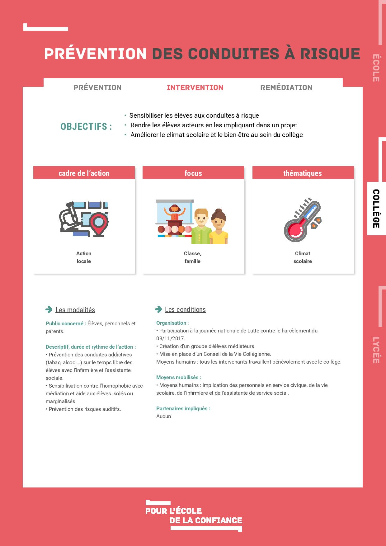 Objectifs : sensibiliser les élèves aux conduites à risque, rendre les élèves acteurs en les impliquant dans un projet, améliorer le climat scolaire et le bien-être au sein du collège