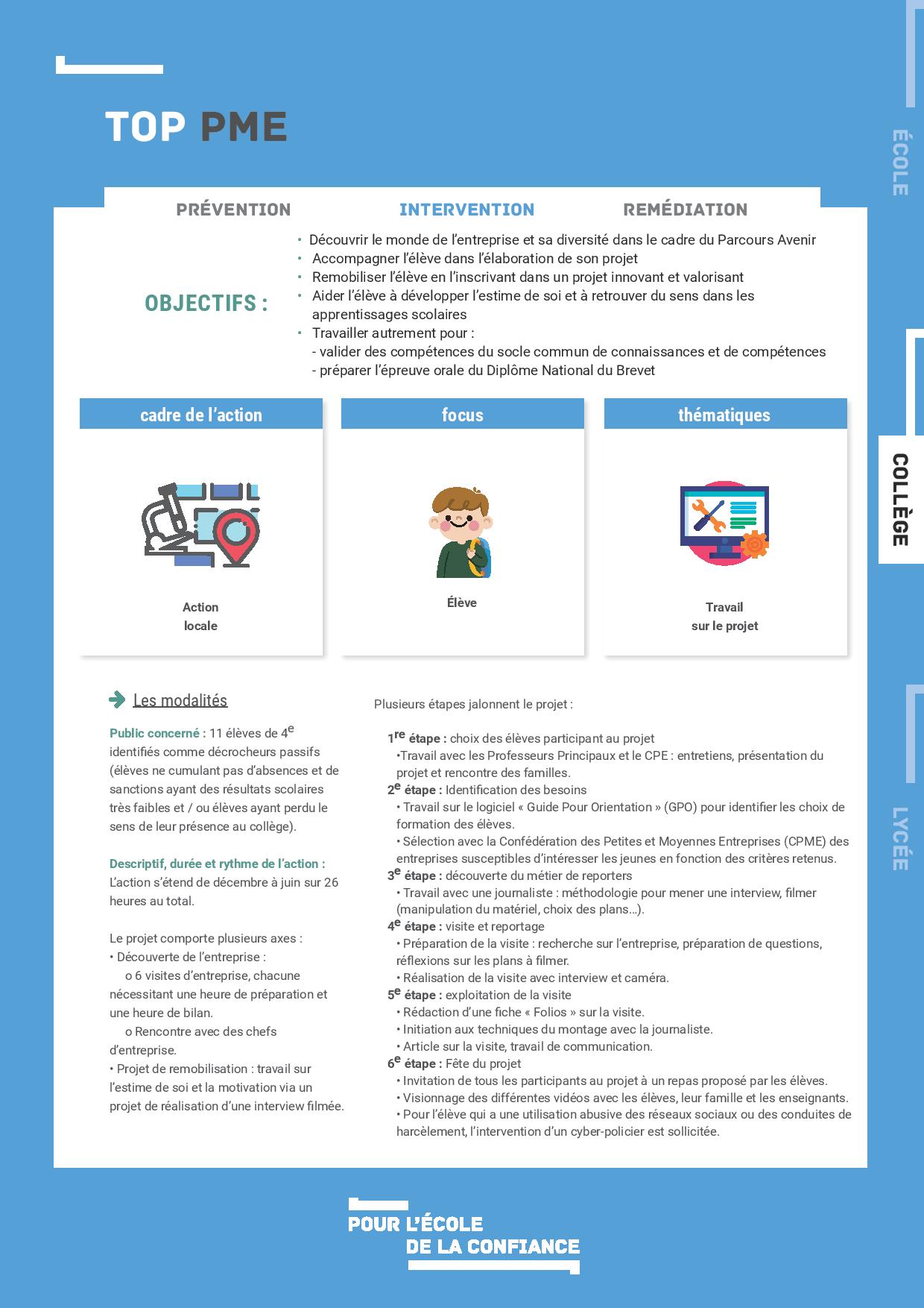 Objectifs : Découvrir le monde de l’entreprise et sa diversité, accompagner l’élève dans l’élaboration de son projet, remobiliser l’élève en l’inscrivant dans un projet innovant et valorisant, aider l’élève à développer l’estime de soi et à retrouver du sens dans les apprentissages scolaires...