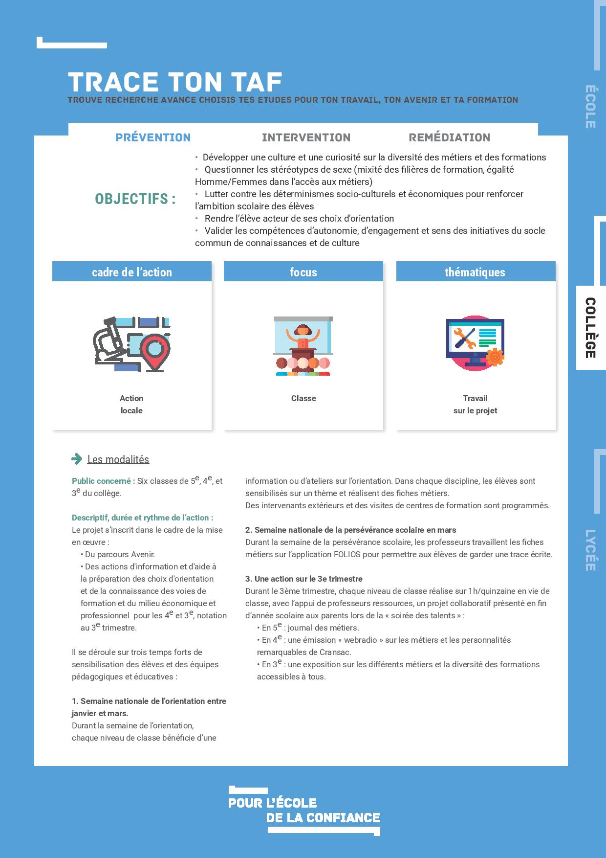 Objectifs : Développer une culture et une curiosité sur la diversité des métiers et des formations, questionner les stéréotypes de sexe, lutter contre les déterminismes socio-culturels et économiques pour renforcer l’ambition scolaire des élèves, rendre l’élève acteur de ses choix d’orientation.