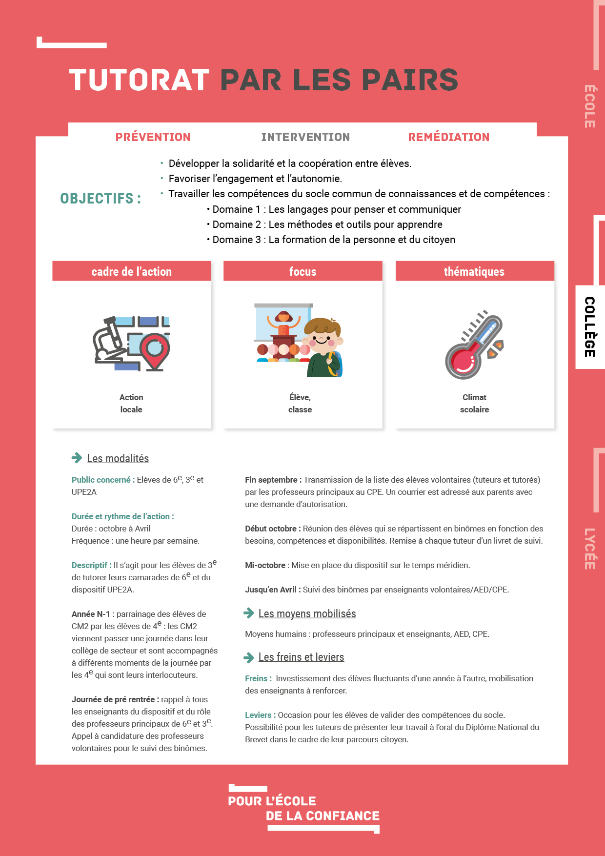 Objectifs : Développer les compétences psychosociales des élèves pour contribuer à l’amélioration du climat scolaire, mobiliser l’établissement, les parents et l’environnement social dans la dynamique impulsée