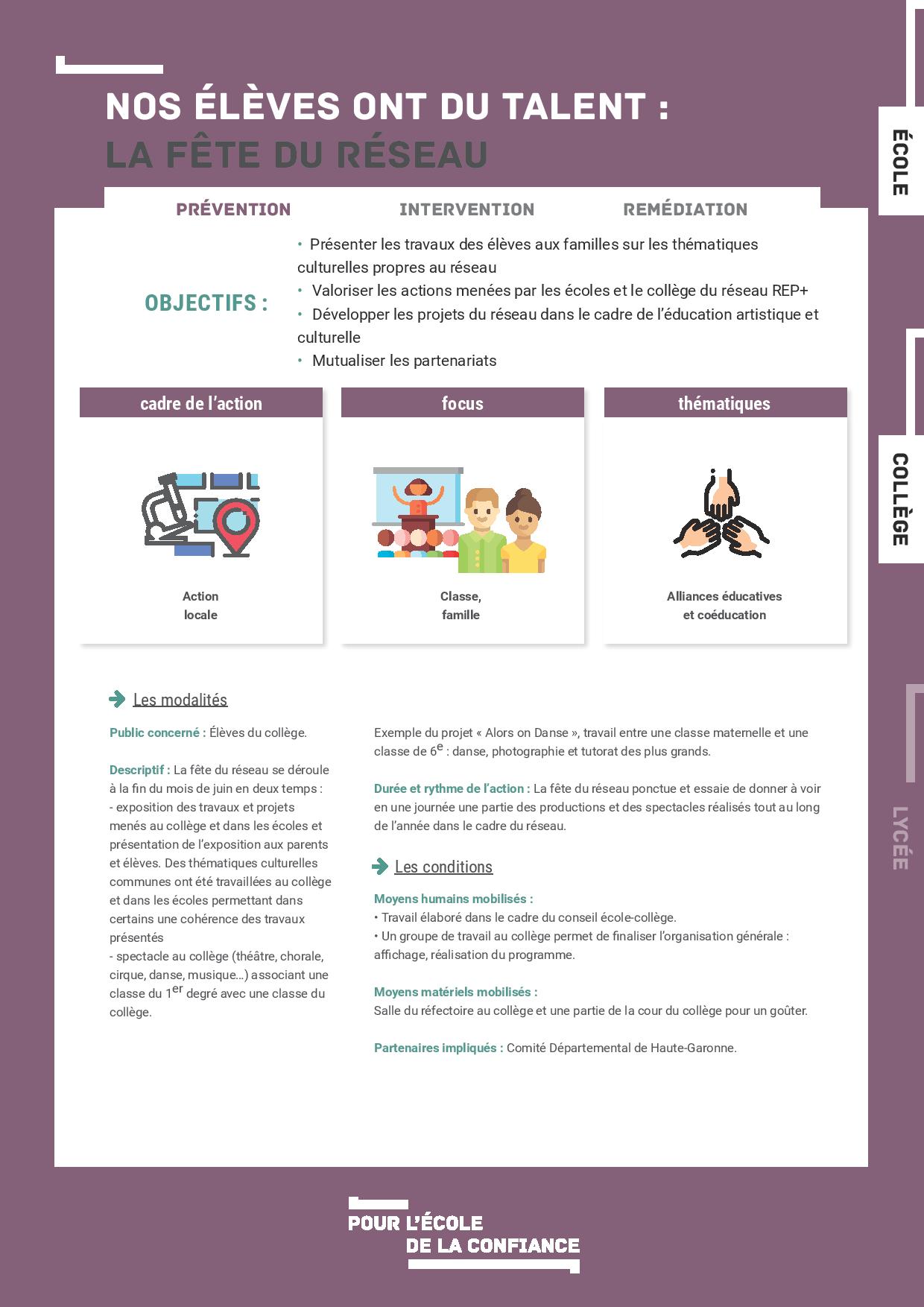 Objectifs : présenter les travaux des élèves aux familles sur les thématiques culturelles propres au réseau, valoriser les actions menées par les écoles et le collège du réseau REP+, développer les projets du réseau dans le cadre de l’éducation artistique et culturelle, mutualiser les partenariats.