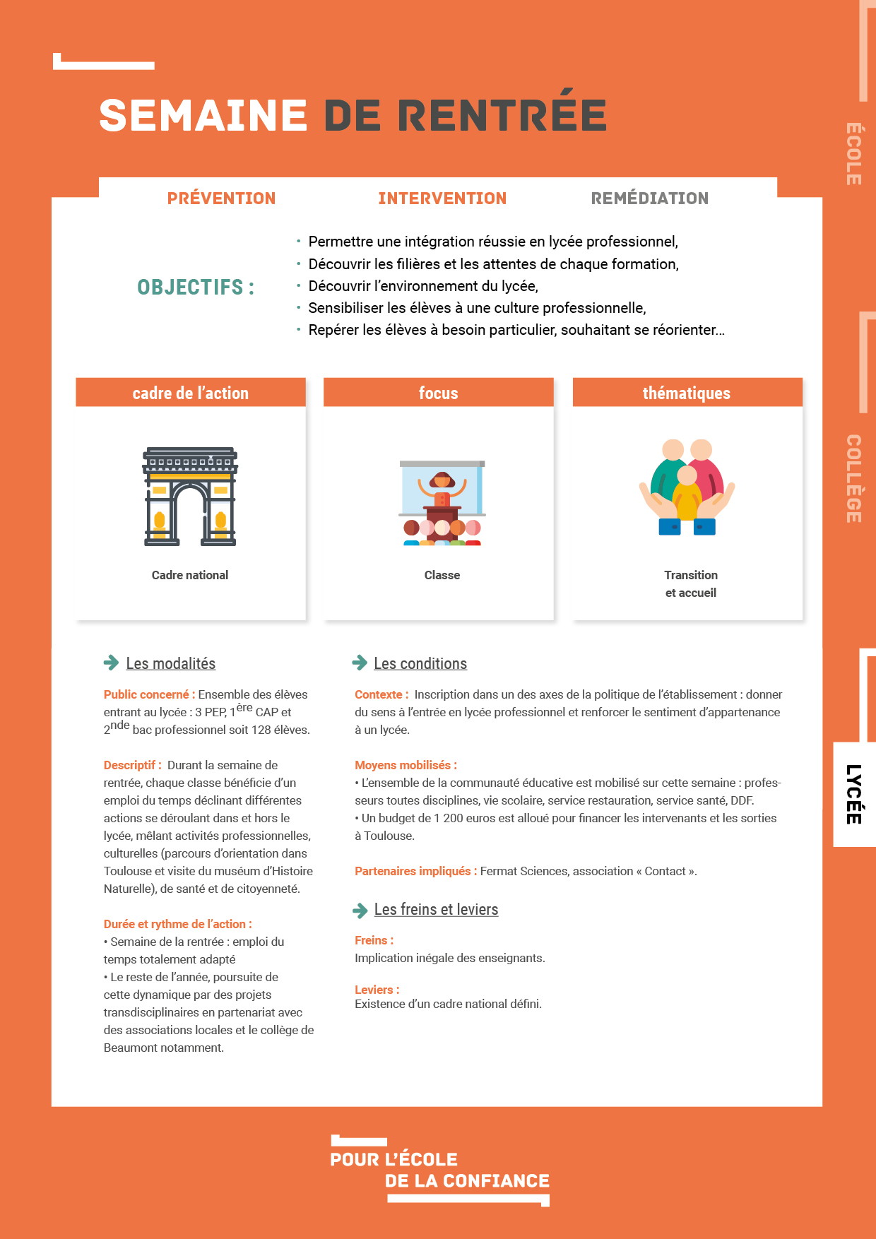 Objectifs : Permettre une intégration réussie en lycée professionnel, découvrir les filières et les attentes de chaque formation, découvrir l’environnement du lycée, sensibiliser les élèves à une culture professionnelle, repérer les élèves à besoin particulier, souhaitant se réorienter…